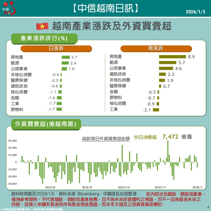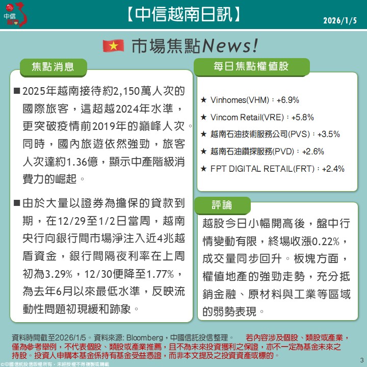 由於大量以證券為擔保的貸款到期,在12/29至1/2日當周,越南央行向銀行間市場淨注入近4兆越盾資金,銀行間隔夜利率在上周 初為3.29%,12/30便降至1.77%,為去年6月以來最低水準,反映流動性問題初現緩和跡象。