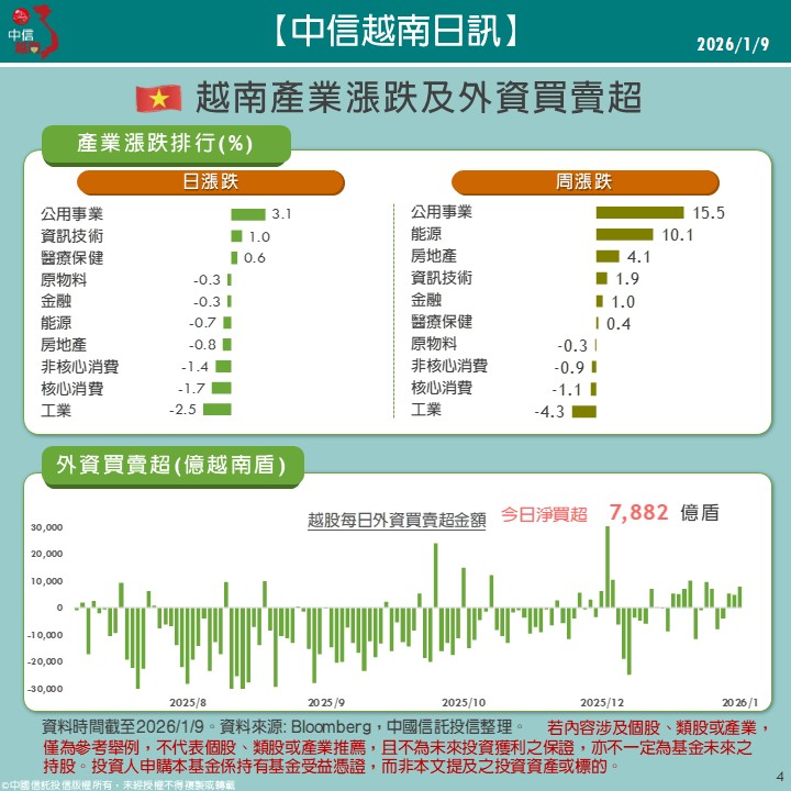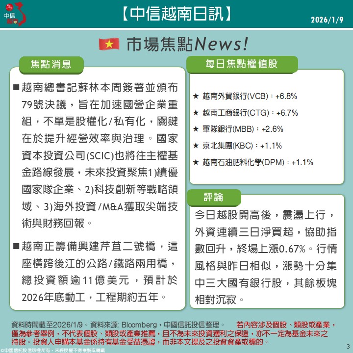 越南總書記蘇林本周簽署並頒布79號決議,旨在加速國營企業重組,不單是股權化/私有化,關鍵在於提升經營效率與治理。國家資本投資公司(SCIC)也將往主權基金路線發展,未來投資聚焦1)績優國家隊企業、2)科技創新等戰略領域、3)海外投資/M&A獲取尖端技術與財務回報。