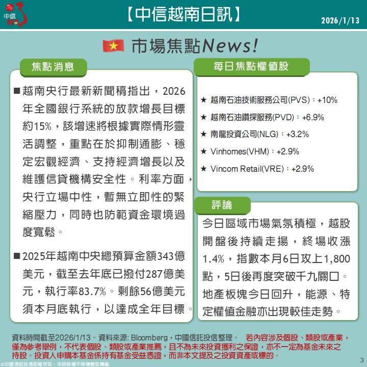 越南央行最新新聞稿指出,2026年全國銀行系統的放款增長目標約15%,該增速將根據實際情形靈活調整,重點在於抑制通膨、穩定宏觀經濟、支持經濟增長以及維護信貸機構安全性。利率方面,央行立場中性,暫無立即性的緊縮壓力,同時也防範資金環境過度寬鬆。