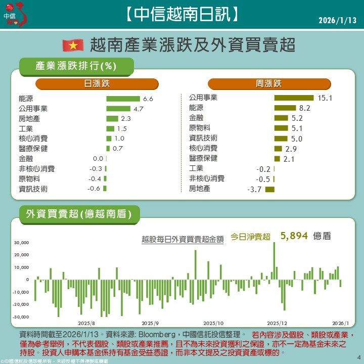 今日區域市場氣氛積極,越股開盤後持續走揚,終場收漲1.4%,指數本月6日攻上1,800點,5日後再度突破千九關口。地產板塊今日回升,能源、特定權值金融亦出現較佳走勢。