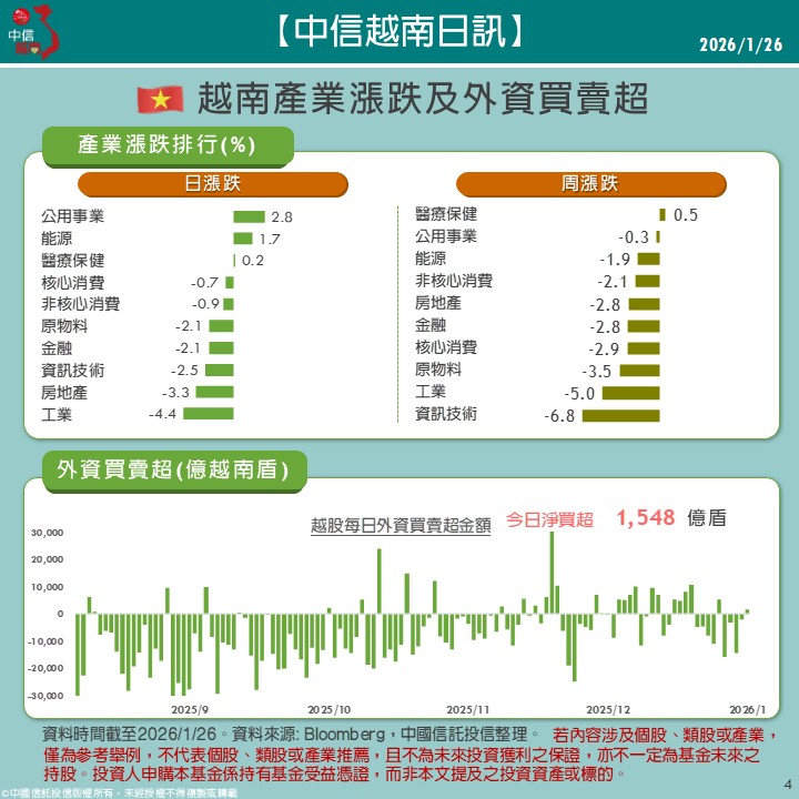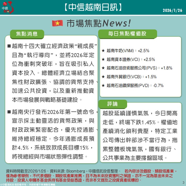越南央行發布2026年第一號命令,宣示採主動靈活的貨幣政策,與財政政策緊密配合,優先控通膨、維持總經穩定。今年通膨成長預 計4.5%,系統放款成長目標15%,將視總經與市場狀態彈性調整。