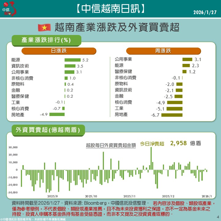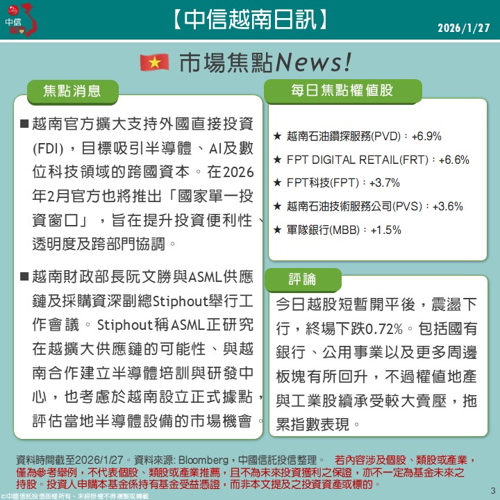 今日越股短暫開平後,震盪下行,終場下跌0.72%。包括國有銀行、公用事業以及更多周邊板塊有所回升,不過權值地產與工業股續承受較大賣壓,拖累指數表現。