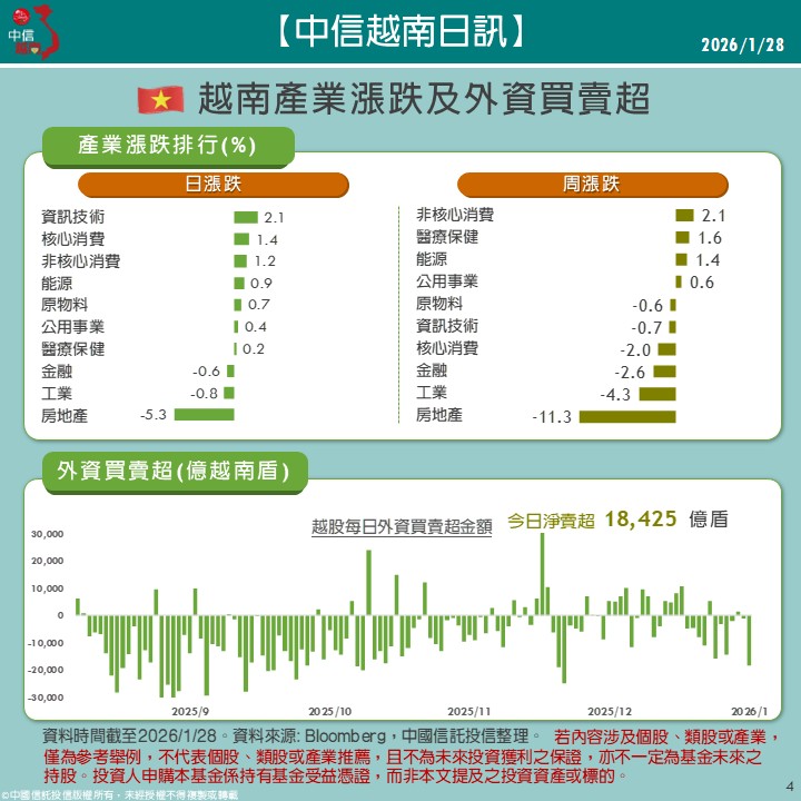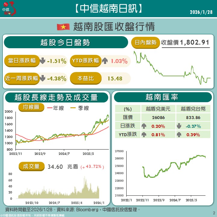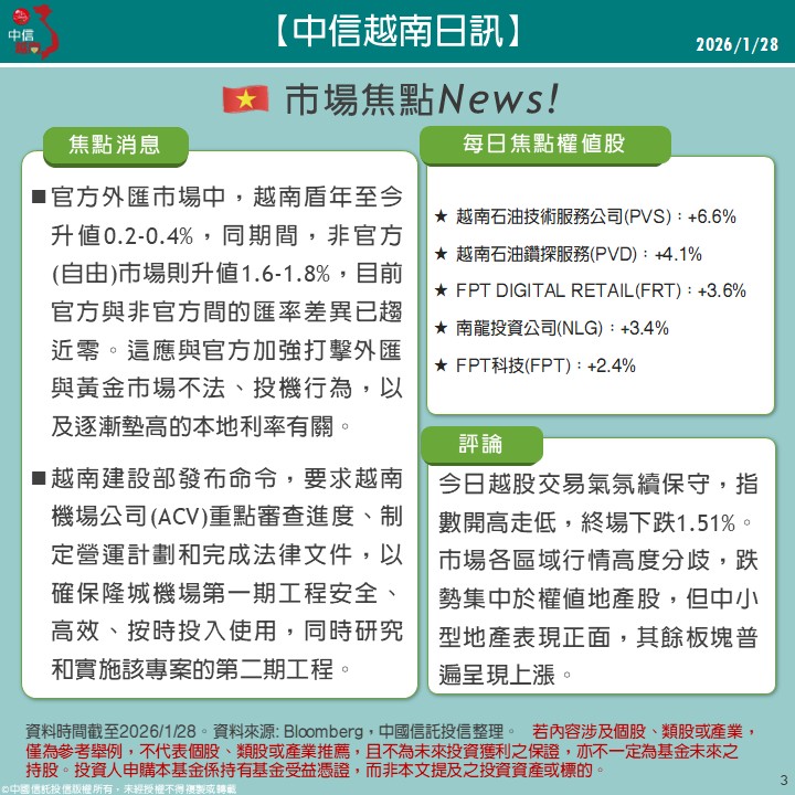 今日越股交易氣氛續保守,指數開高走低,終場下跌1.51%。市場各區域行情高度分歧,跌勢集中於權值地產股,但中小型地產表現正面,其餘板塊普遍呈現上漲。