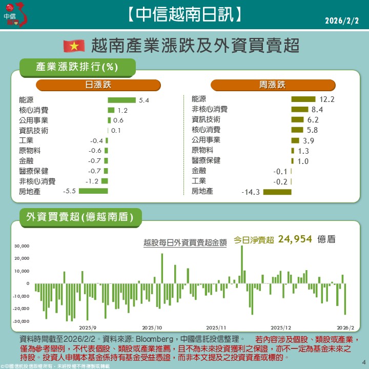 今日亞股普遍重挫,越股低開後持續下行,午後跌幅收斂,終場仍下跌1.23%,外資淨賣超擴大。板塊方面,跌勢集中於權值地產,其餘多數板塊的行情變化相對溫和。