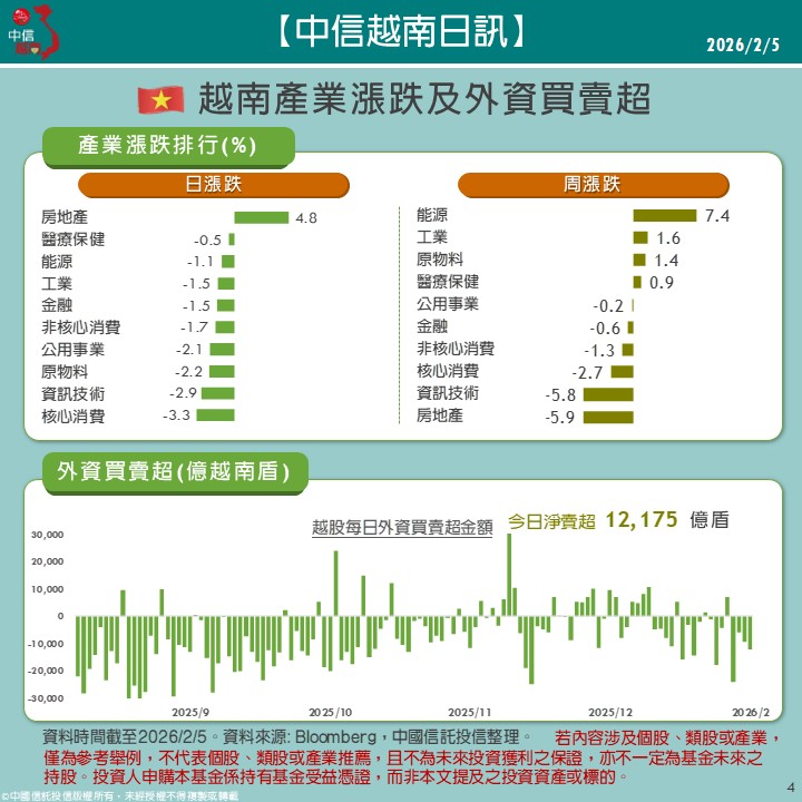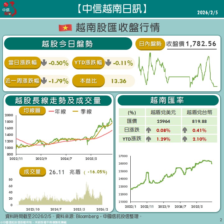 今日越股盤勢震盪,個股普遍走弱,僅少數權值股撐盤,指數在平盤附近拉鋸,終場小跌0.5%。盤面以房地產族群表現相對突出,其餘板塊上漲個股零星分散,難以形成有效輪動。