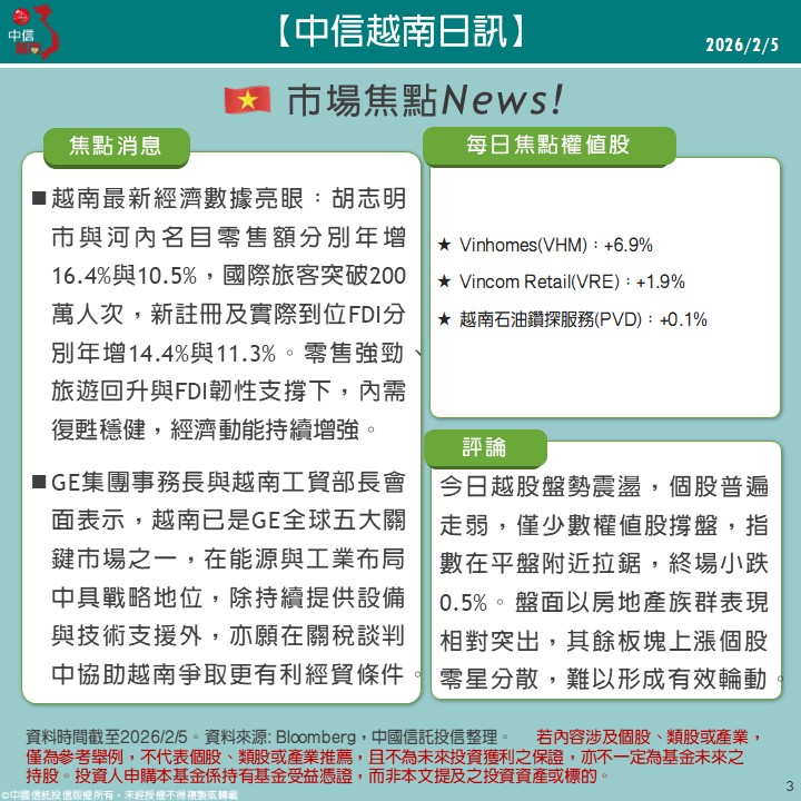 越南最新經濟數據亮眼:胡志明市與河內名目零售額分別年增16.4%與10.5%,國際旅客突破200萬人次,新註冊及實際到位FDI分別年增14.4%與11.3%。零售強勁、旅遊回升與FDI韌性支撐下,內需復甦穩健,經濟動能持續增強。