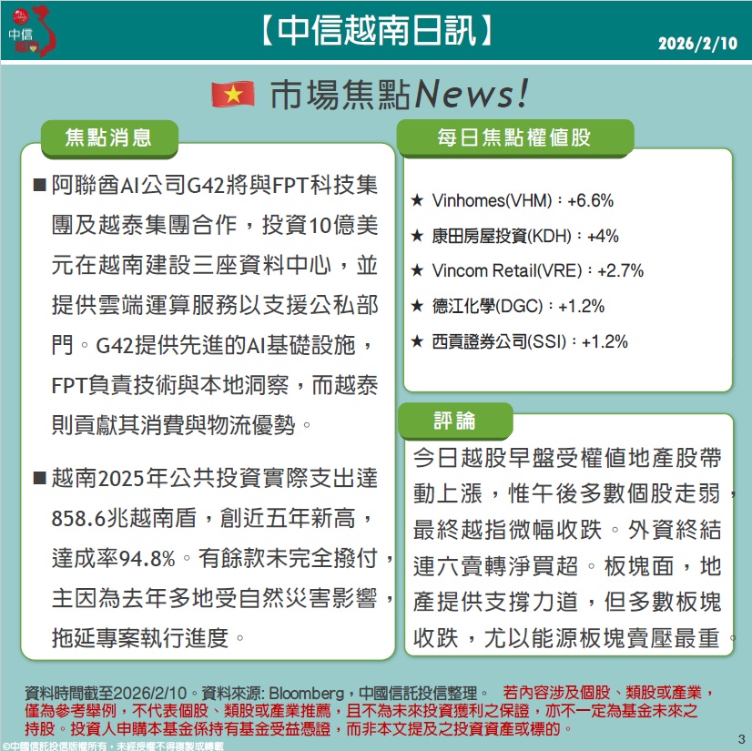 阿聯酋AI公司G42將與FPT科技集團及越泰集團合作,投資10億美元在越南建設三座資料中心,並提供雲端運算服務以支援公私部門。G42提供先進的AI基礎設施,FPT負責技術與本地洞察,而越泰則貢獻其消費與物流優勢。