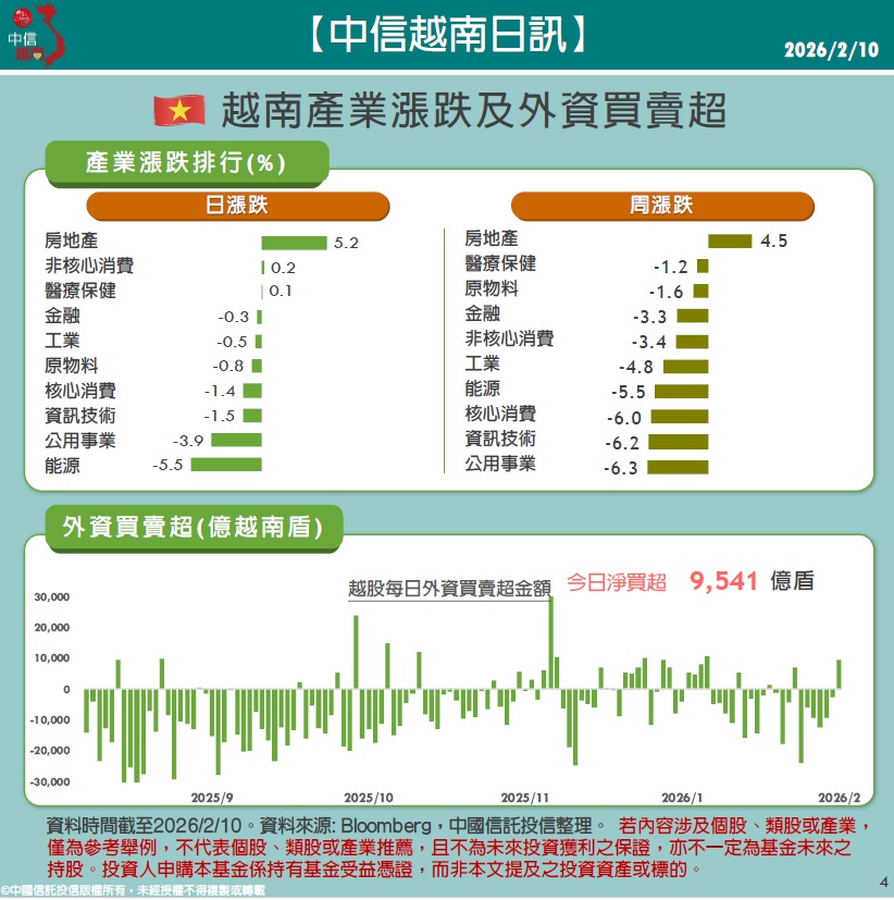 今日越股早盤受權值地產股帶動上漲,惟午後多數個股走弱,最終越指微幅收跌。外資終結連六賣轉淨買超。板塊面,地產提供支撐力道,但多數板塊收跌,尤以能源板塊賣壓最重。