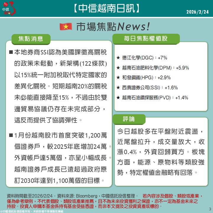 本地券商SSI認為美國課徵高關稅 的政策未鬆動,新架構(122條款)以15%統一附加稅取代特定國家的差異化關稅。短期越南20%的關稅未必能直接降至15%,不過由於雙邊貿易協議仍存在未完成部分,這反而提供了協調彈性。
