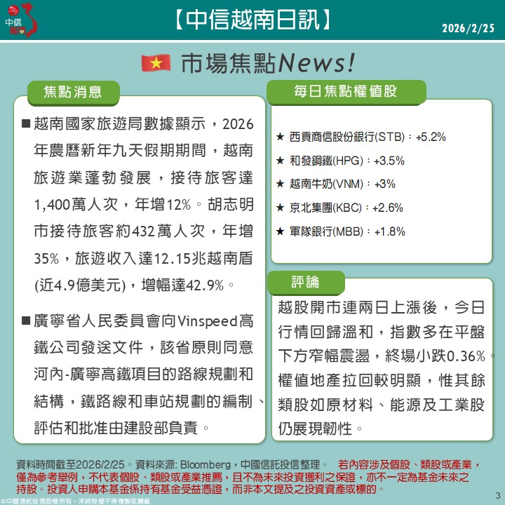 越南國家旅遊局數據顯示,2026年農曆新年九天假期期間,越南旅遊業蓬勃發展,接待旅客達1,400萬人次,年增12%。胡志明市接待旅客約432萬人次,年增35%,旅遊收入達12.15兆越南盾(近4.9億美元),增幅達42.9%。廣寧省人民委員會向Vinspeed高鐵公司發送文件,該省原則同意河內-廣寧高鐵項目的路線規劃和結構,鐵路線和車站規劃的編制、評估和批准由建設部負責。