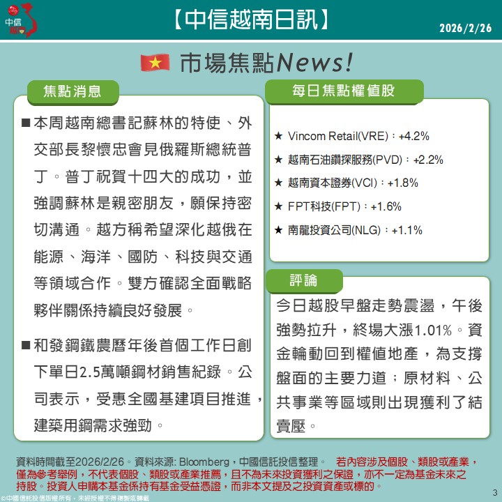今日越股早盤走勢震盪,午後強勢拉升,終場大漲1.01%。資金輪動回到權值地產,為支撐盤面的主要力道;原材料、公共事業等區域則出現獲利了結賣壓。