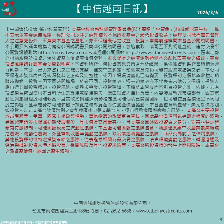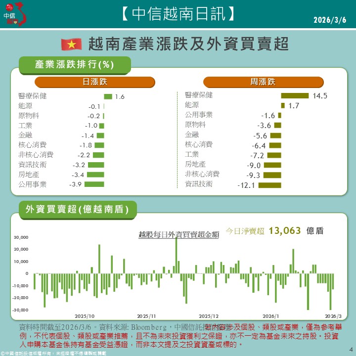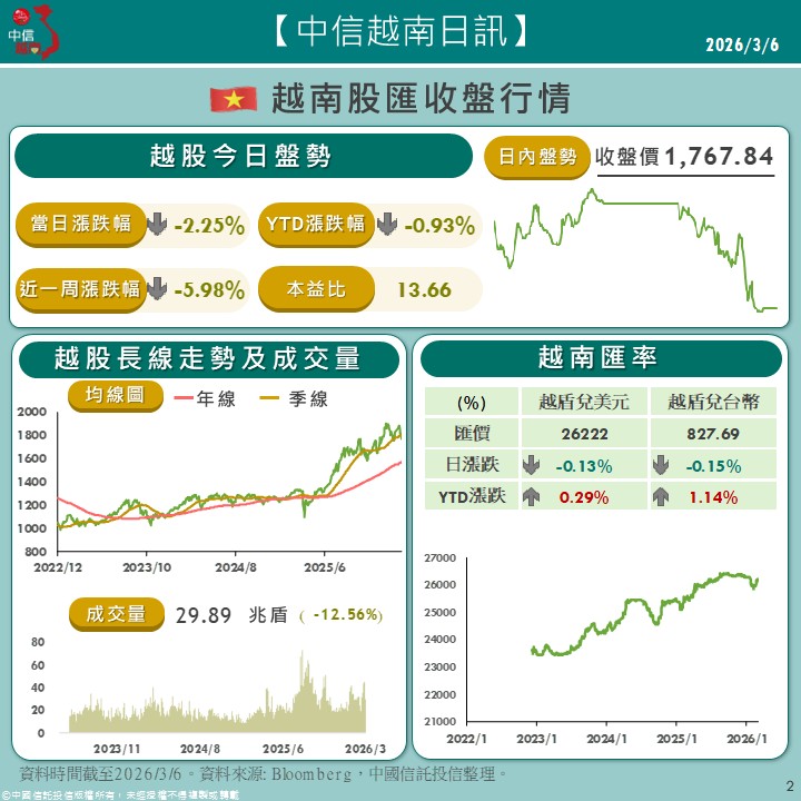 戰爭不確定性壟罩,越股午盤後於外資賣壓壟罩、內資接盤意願低落的壓力下,今日盤勢走弱,收盤下跌2.25%,僅能源板塊相對強勢。