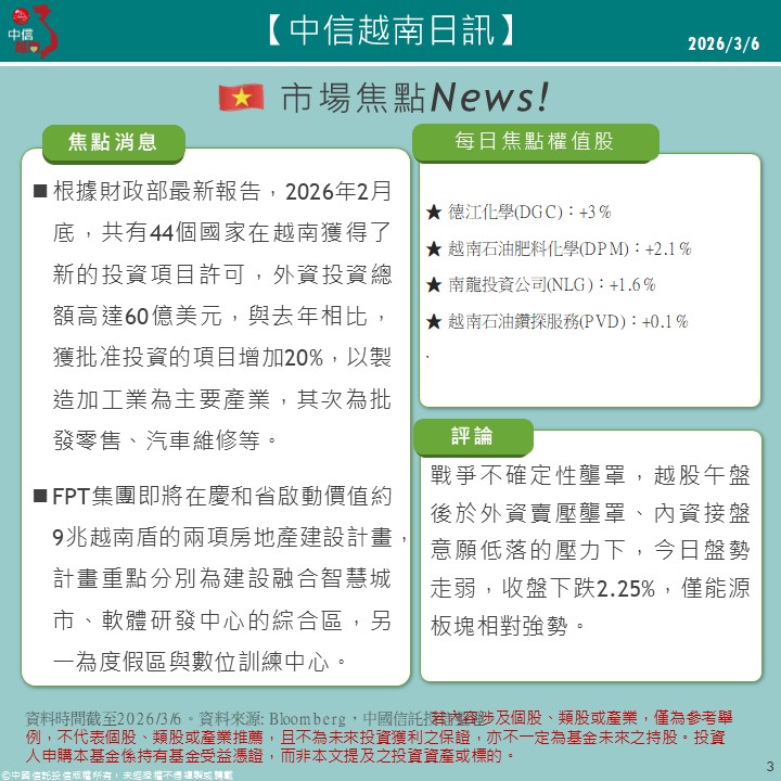 根據財政部最新報告,2026年2月底,共有44個國家在越南獲得了新的投資項目許可,外資投資總額高達60億美元,與去年相比,獲批准投資的項目增加20%,以製造加工業為主要產業,其次為批發零售、汽車維修等。