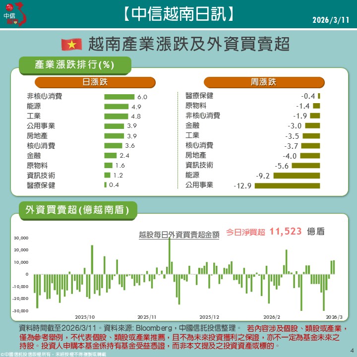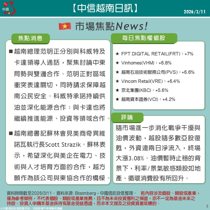 隨市場進一步消化戰爭干擾與油價波動,越股隨多數亞股復甦,外資連兩日淨流入,終場大漲3.08%。油價暫時止穩的背景下,利率/景氣敏感類股如地產、循環消費股有所回升。