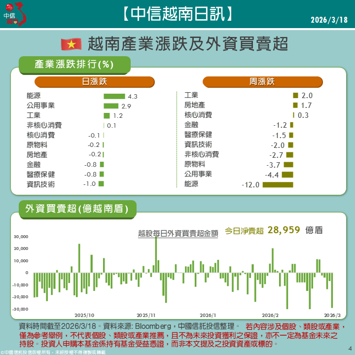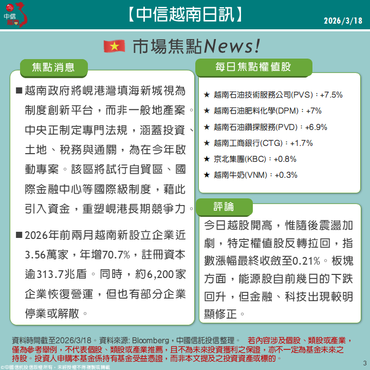 今日越股開高,惟隨後震盪加劇,特定權值股反轉拉回,指數漲幅最終收斂至0.21%。板塊方面,能源股自前幾日的下跌回升,但金融、科技出現較明顯修正。