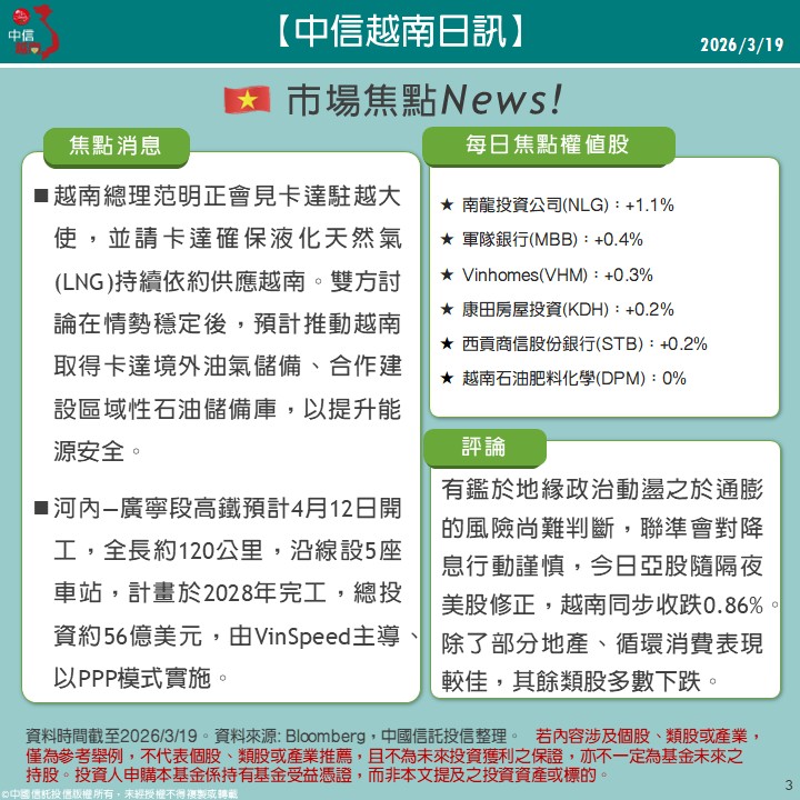 越南總理范明正會見卡達駐越大使,並請卡達確保液化天然氣(LNG)持續依約供應越南。雙方討論在情勢穩定後,預計推動越南取得卡達境外油氣儲備、合作建設區域性石油儲備庫,以提升能源安全。