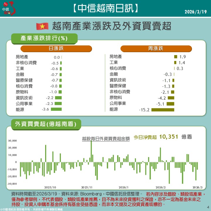 有鑑於地緣政治動盪之於通膨的風險尚難判斷,聯準會對降息行動謹慎,今日亞股隨隔夜美股修正,越南同步收跌0.86%。除了部分地產、循環消費表現較佳,其餘類股多數下跌。