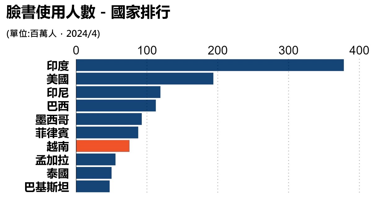 越南臉書使用人數為全球第七大國