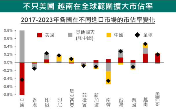 根據三菱日聯(MUFG)1月最新報告顯示,越南近年來不僅在美國市場的進口佔比持續上升,在全球市場的出口表現同樣亮眼。數據顯示,越南對美國的出口市佔率已從2017年的2%上升至目前的4%。