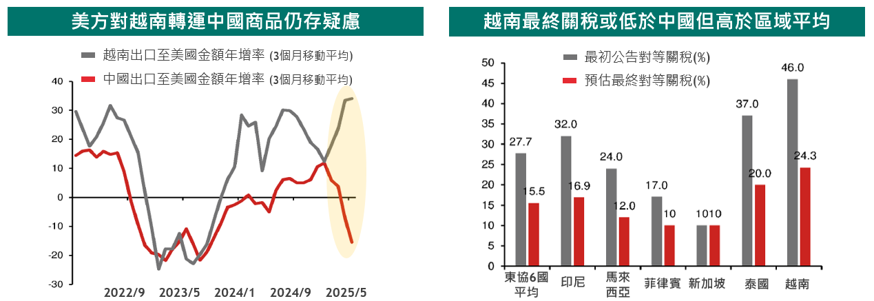 其次,關於洗產地議題,越方表示企業會願意配合減少對中國依賴,但需要調整時間。進一步細看近月越南出口至美國金額年增率,以及中國出口至美國年金額年增率,兩者增速呈現反向關係,暗示美國對於越南轉運中國商品的疑慮或有一定依據。