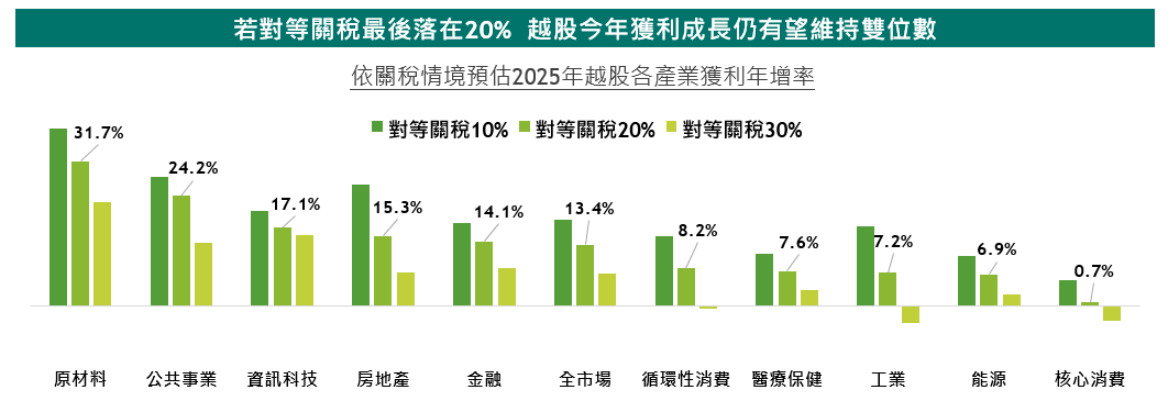 越南當地券商進一步指出,若越南對等關稅落在20%上下之情境,今年越股之獲利成長預估落在13.4%,企業將展現基本面韌性,權值股如金融、地產,均有望保持優異的獲利動能,特別是當關稅稅率宣布,政策不確定性消除,場邊觀望資金可望重返越股,資金面可望進一步推動越股走勢。
