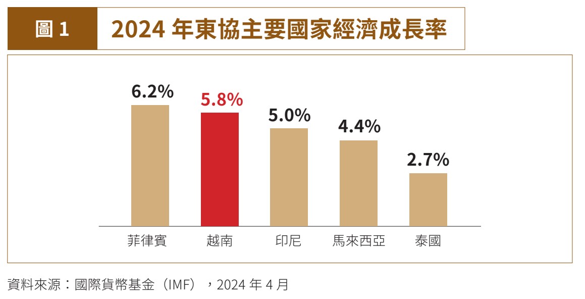 根據國際貨幣基金(IMF)的數據,越南目前GDP已經達到4,658億美元,這樣的成績,讓越南躋身東南亞地區第五大經濟體,只落後印尼、泰國、菲律賓和新加坡,超越馬來西亞。展望2024年,越南的GDP成長率將達到5.8%,預期比中國的成長速度還要更快;放眼新興市場整體平均的4.2%,越南的經濟成長速度也是一枝獨秀。